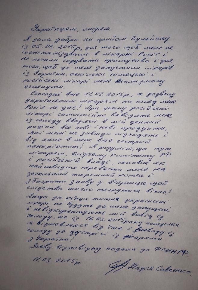 Он также опубликовал письмо Надежды Савченко, в котором она написала, что если до конца недели украинские врачи не будут к ней допущены, то она возобновит голодовку с понедельника, 16 марта.