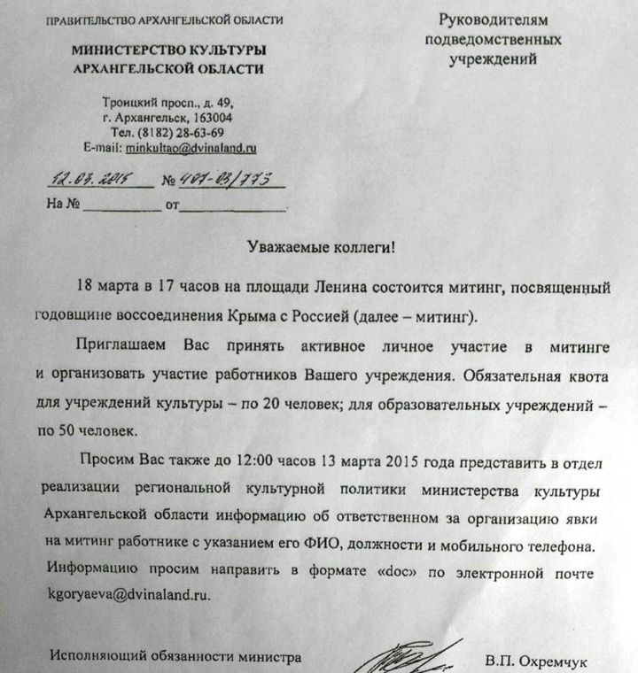 Министерство культуры Архангельской области обязало сотрудников подведомственных учреждений принять участие в митинге, посвященном годовщине оккупации Крыма с Россией. Об этом сообщает в пятницу, 13 марта, агентство Flash Nord со ссылкой на копию письма, которое появилось в распоряжении редакции.