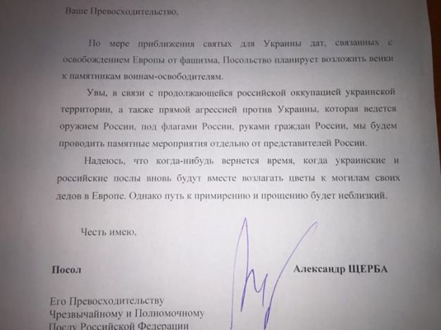 Посол Украины в Австрии Александр Щерба направил официальное письмо своему российскому коллеге, Сергею Нечаеву, в котором отказал послу РФ в Австрии в участии в совместных мероприятиях по поводу окончания Второй мировой войны.