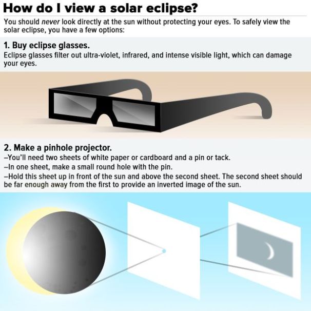Специалисты говорят, что есть несколько способов наблюдать солнечное затмение безопасно и рекомендует проекции, фильтры или телескопы, оснащенные солнечными фильтрами.