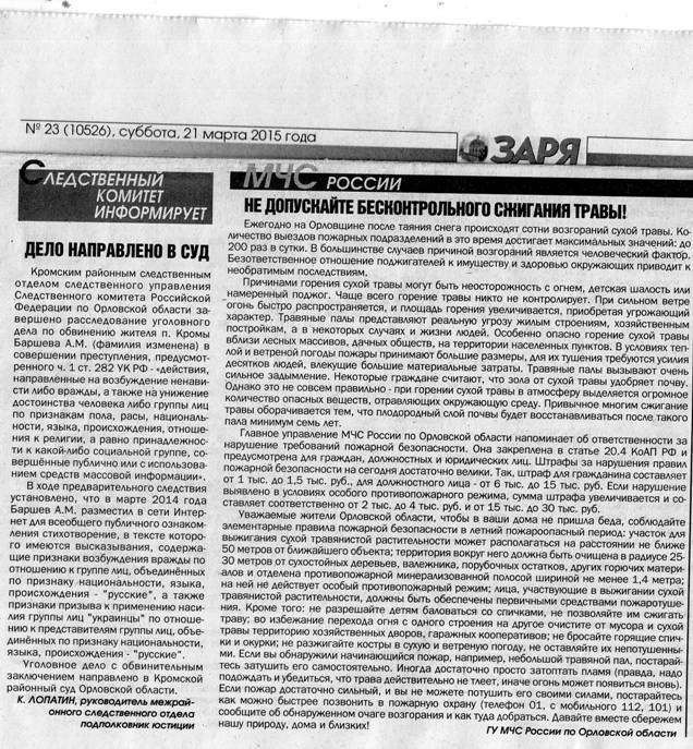 В частности, по его словам, в районной газете пос. Кромы (Орловская область, РФ) 4/5 всех опубликованных материалов посвящено массовому ликованию послушных граждан по поводу героического «взятия Севастополя». Но есть в номере также материал об окончании расследования дела по обвинению Бывшева в разжигании ненависти и вражды в своих стихах.