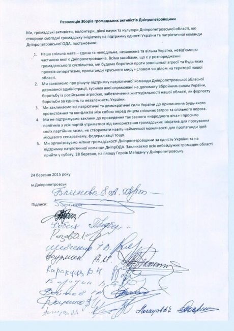 В резолюции отмечается, что активисты выражают «решительную поддержку патриотической команды Днепропетровской областной государственной администрации, усилия которой направлены на помощь Вооруженным силам Украины, борьбу с российской агрессией, обеспечение жизнедеятельности нашей области, как форпоста борьбы за единство и независимость Украины».