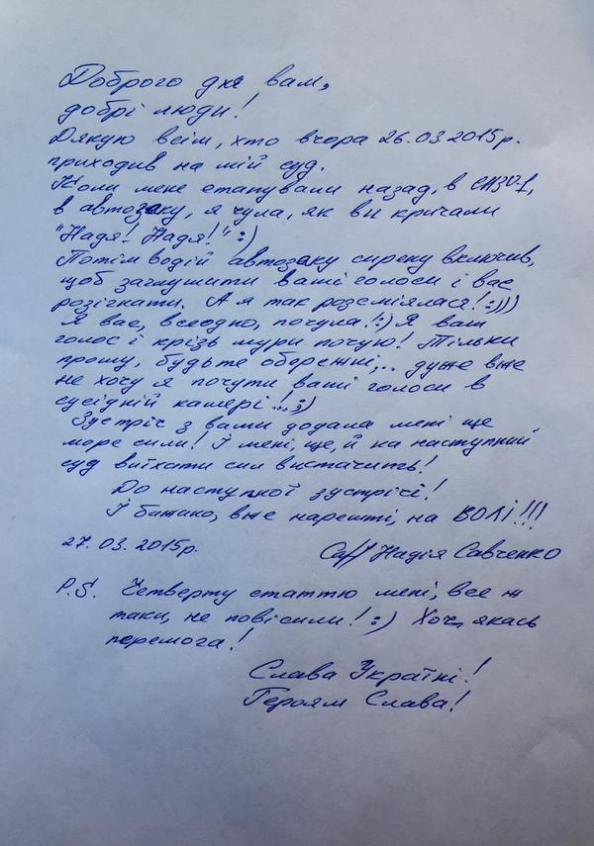 «Всем спасибо, кто вчера 26.03.15г. приходил на мой суд. Когда меня этапировали назад в СИЗО №1, в автозаке я слышала, как вы кричали: «Надя! Надя!». Потом водитель автозака сирену включил, чтобы заглушить ваши голоса и вас разогнать, а я так рассмеялась! Я вас все равно услышала. Я ваш голос и сквозь стены услышу! Только прошу, будьте осторожны, очень не хочу услышать ваши голоса в соседней камере. Встреча с вами добавила мне море силы, и мне еще и на следующий суд выехать сил хватит. Четвертую статью мне все же не повесили», - написала она.
