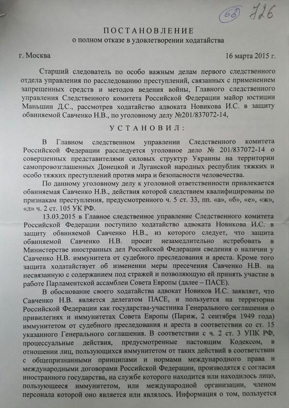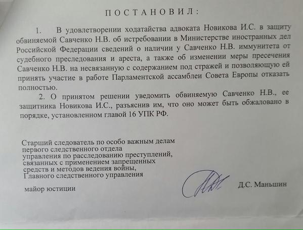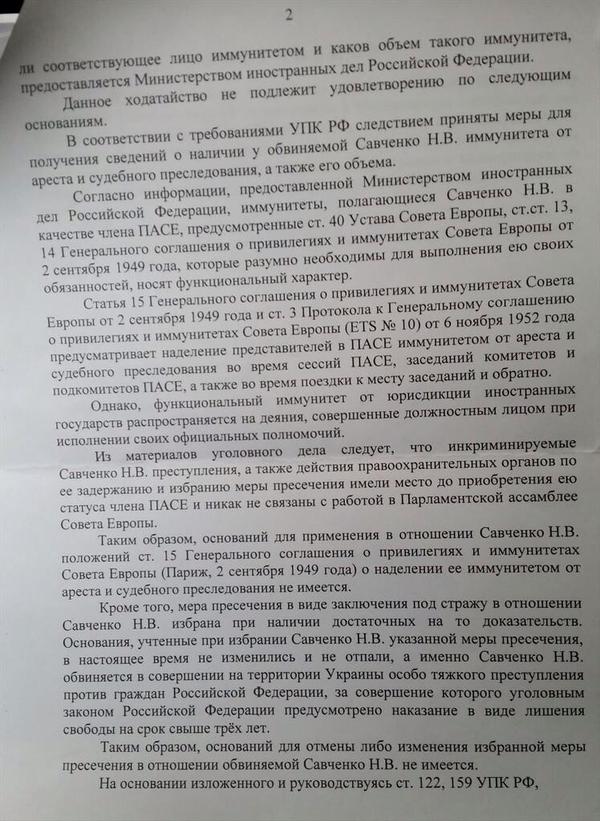 «В удовлетворении ходатайства адвоката Новикова И.С в защиту обвиняемой Савченко Н.В. об истребовании у Министерства иностранных дел Российской Федерации сведений о наличии у Савченко Н.В. иммунитета от судебного преследования и ареста, а также об изменении меры пресечения Савченко Н.В. на такую, которая не связана с содержанием под стражей и позволяет ей принять участие в работе Парламентской ассамблеи Совета Европы, отказать полностью», - говорится в постановлении.