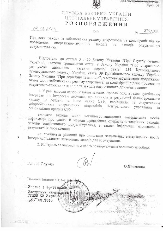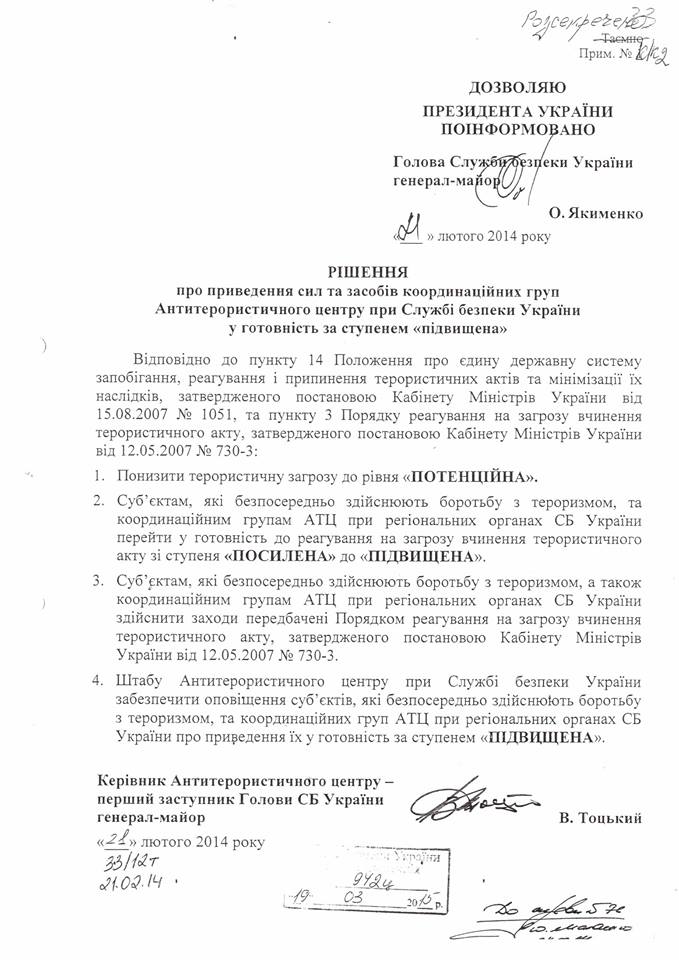Среди рассекреченных документов – подписанное экс-главой СБУ Якименко 21 февраля 2014 года решение о приведении сил и средств координационных групп Антитеррористического центра при СБУ в готовность по степени «повышенный».