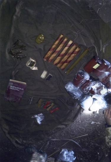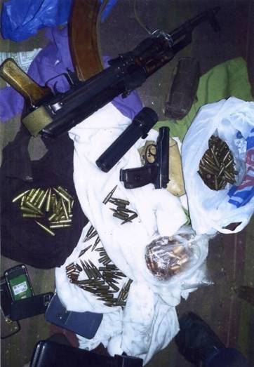 Правоохранители изъяли из тайника террористов 3 кг пластида, 5 шашек аммонита и 5 запалов к ним, 2 автомата АК, пистолет ПМ, 312 патронов различного калибра, гранату РГД-5, 1 сигнальную мину, глушитель к АКСМ, ноутбук и сервер.