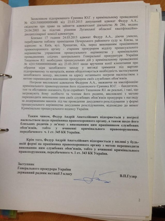 В отношении адвоката Андрея Федура, который сейчас ведет дело по защите экс-первого заместителя генпрокрора Рената Кузьмина и следователя Генпрокуратуры Сергея Войченко, открыто уголовное производство по подозрению в угрозах насилием в отношении сотрудника правоохранительного органа (ч. 1 ст. 345 Уголовного кодекса Украины).