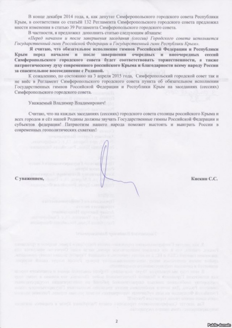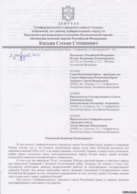 Депутат оккупационного горсовета Симферополя от КПРФ Степан Кискин пожаловался Путину, что депутаты не приняли его предложение исполнять гимн России в начале и конце заседаний.