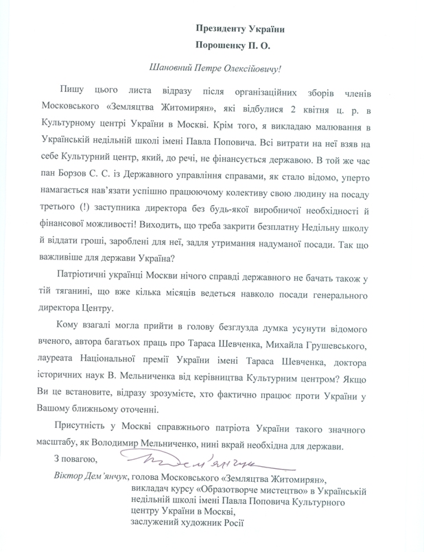 Председатель Московского «Землячества Житомирян», преподаватель курса «Изобразительного искусства» в Украинской воскресной школе имени Павла Поповича Культурного центра Украины в Москве, заслуженный художник России Виктор Демьянчук выступил против отстранения Владимира Мельниченко от руководства Культурным центром и назначения третьего замдиректора центра. Об этом говорится в его письме к Президенту, которое поступило в распоряжение «Главкома».
