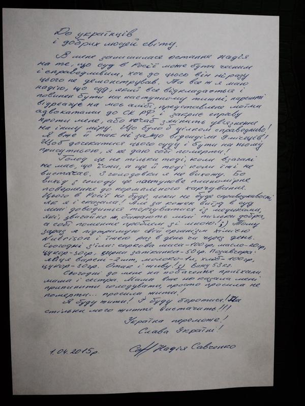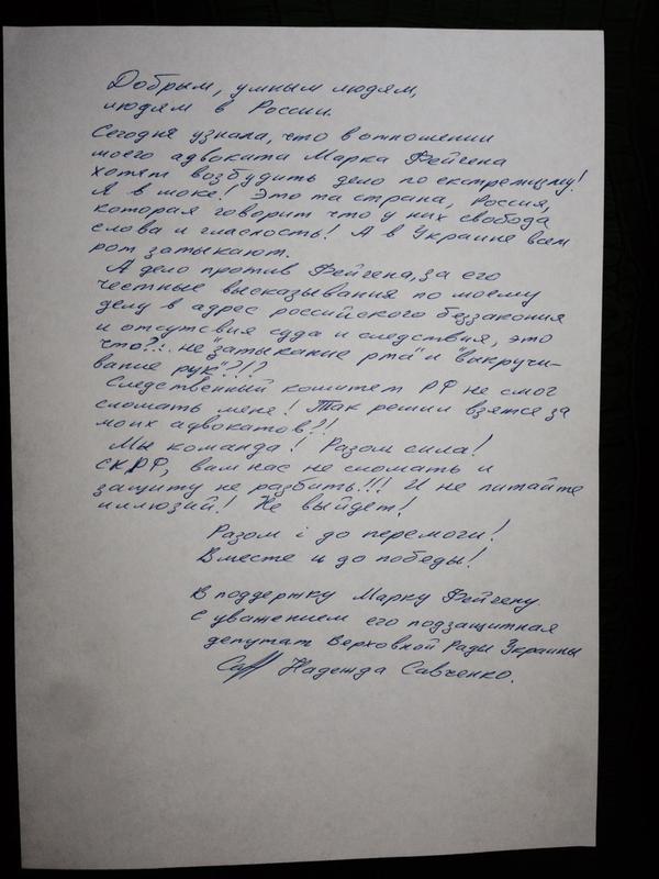 Незаконно удерживаемая в московском СИЗО украинская летчица и народный депутат Надежда Савченко написала письмо, в котором рассказала о своей голодовке и деле против ее адвоката Марка Фейгина. Соответствующее письмо опубликовал в своем Twitter другой адвокат летчицы Николай Полозов.