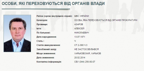 Министерство внутренних дел Украины объявило в розыск сына экс-премьер-министра Николая Азарова, бывшего народного депутата от Партии регионов Алексея Азарова.