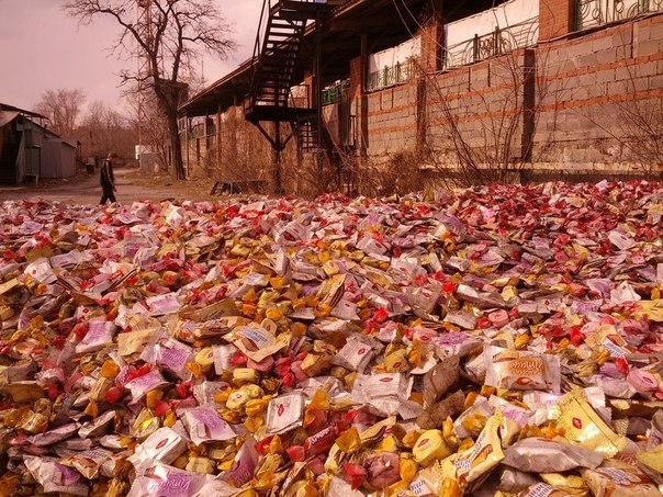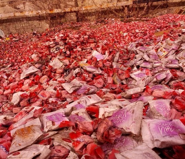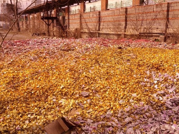 На одной из улиц Донецка жители обнаружили горы выброшенных сладостей. Фотографии разместили в группе «Это Донецк, детка!» в социальной сети.