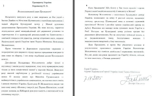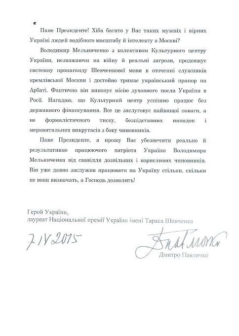 Герой Украины, лауреат Национальной премии Украины имени Тараса Шевченко Дмитрий Павлычко просит главу Украинского государства Петра Порошенко сберечь Культурный центр в Москве духовным представителем Президента Украины. Об этом он написал в своем открытом письме к Порошенко, которое попало в распоряжение «Главкома».