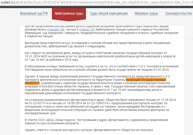 В обосновании своего иска Департамент соцзащиты населения города Москвы сообщил: «после заключения контракта на территории Украины произошел государственный переворот, сопряженный с захватом государственной власти в Киеве и началом антитеррористической операции в Юго-Восточных областях Украины, в связи с чем, госзаказчик счел невозможным подвергать жизнь и здоровье детей-инвалидов в возрасте от 7 до 15 лет неоправданному риску и невозможным дальнейшее исполнение Государственного контракта».