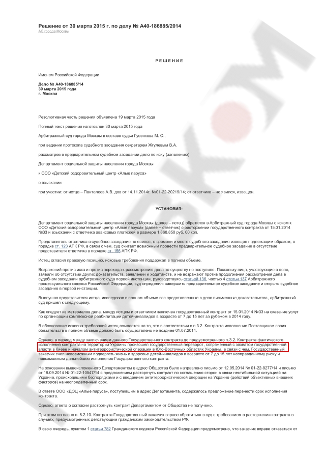 Департамент социальной защиты населения города Москвы проиграл суд у Детского оздоровительного центра «Алые паруса» (Скадовск, Украина), требуя разорвать контракт и взыскать с ответчика аванс.