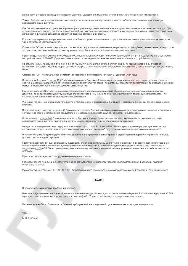 Арбитражный суд Москвы 30 марта 2015 года отказался удовлетворять требование московских властей о расторжении контракта.