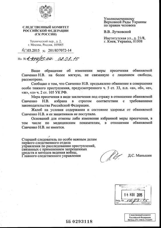 «Оснований для отмены либо изменения избранной меры пресечения, в том числе по медицинским показателям, в отношении обвиняемой Савченко Н.В. не имеется», - подчеркивается в документе.
