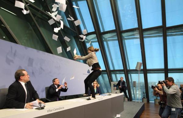 Молодая женщина прервала выступление главы Европейского центрального банка (ЕЦБ) Марио Драги, когда внезапно забралась на его стол и бросила в чиновника листы бумаги. Об этом пишет The Guardian.