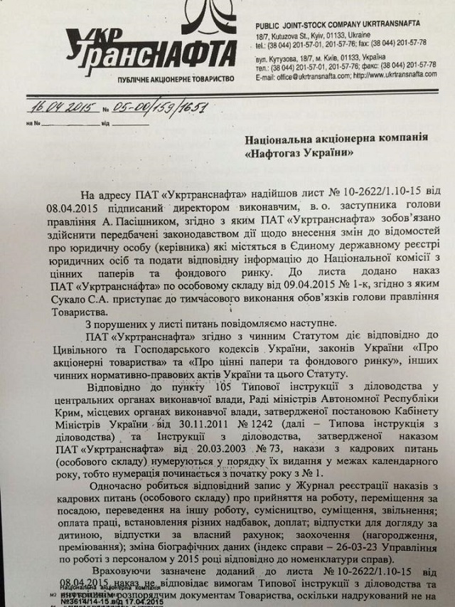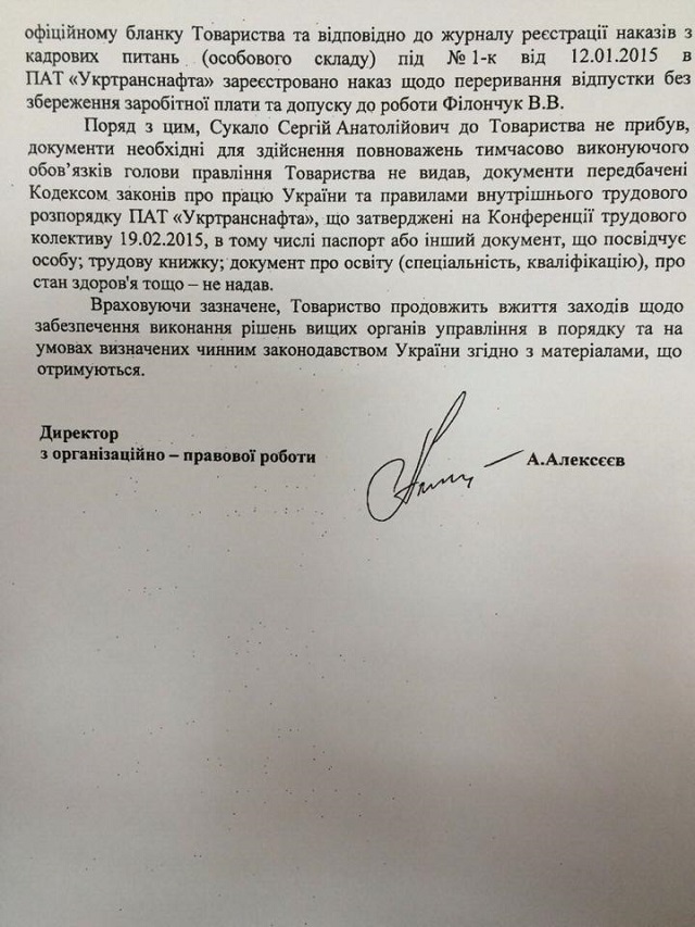 В указанном письме Укртранснафта утверждает, что Сукало не прибыл в центральный офис Укртранснафты и не предоставил необходимых документов для осуществления своих полномочий.