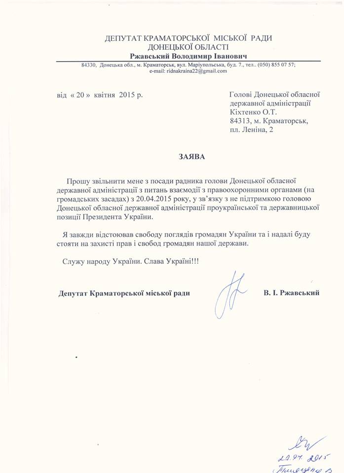 Советник главы Донецкой областной государственной администрации Александра Кихтенко Владимир Ржавский уволился из-за негосударственной позиции губернатора. Об этом он написал в своем Facebook.