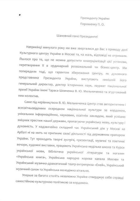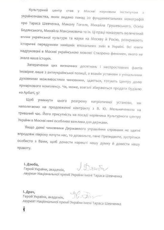 «Чтобы избежать этого разгрома патриотического учреждения, мы настаиваем на продолжении контракта с В. Е. Мельниченко на длительное время. Его присутствие на должности руководителя Культурного центра Украины в Москве сегодня особенно важно для государства. Если некоторые чиновники Государственного управления делами не способны в течение года услышать нас, то позвольте, господин Президент, встретиться с Вами, чтобы донести нашу мысль и доказать нашу правоту», - написали деятели украинской культуры и науки.