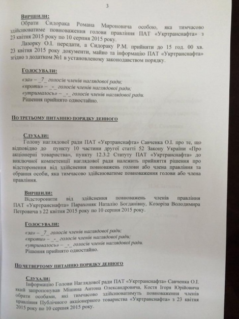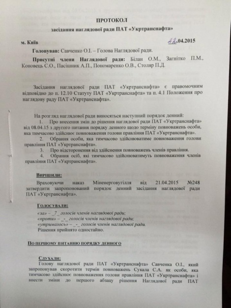Согласно протоколу, Сидорак временно будет осуществлять полномочия председателя правления «Укртранснафты» с 23 апреля 2015 года по 10 августа 2015 года.