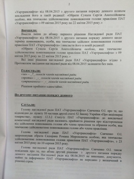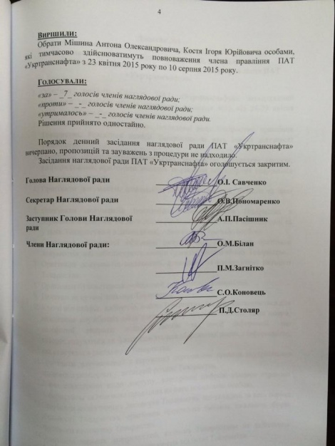 Кроме того, на заседании было принято решение об отстранении от осуществления полномочий членов правления «Укртранснафты» Натальи Парахоняк и Владимира Козорина с 22 апреля по 10 августа 2015 года.