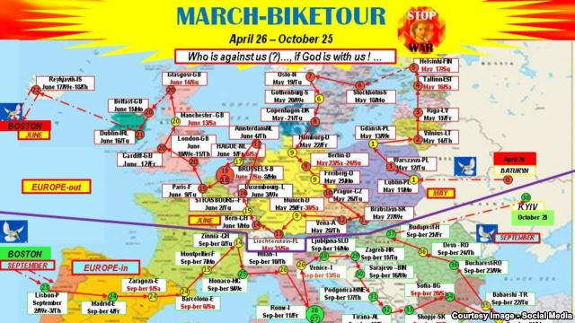 По его словам, вопреки тому, что велопробег проводится для наступления мира в Донбассе, участники не собираются посещать Россию: «В Россию мы не идем, но в каждой стране, где мы будем останавливаться, в российском посольстве мы будем оставлять просьбу, чтобы, со своей стороны, народы России тоже остановили войну».