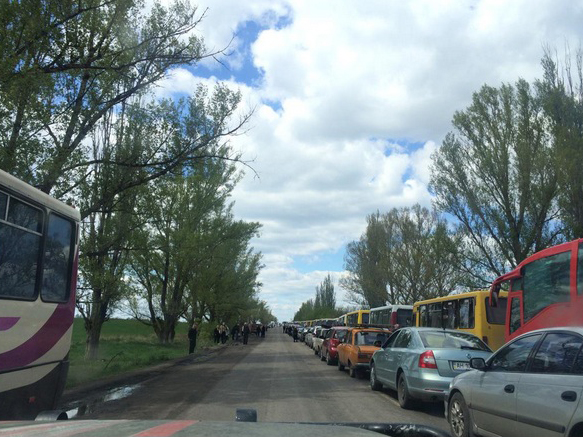 Около ста машин стоят в очереди на блокпосту на выезде из города Марьинка, расположенном на окраине Петровского района Донецка.