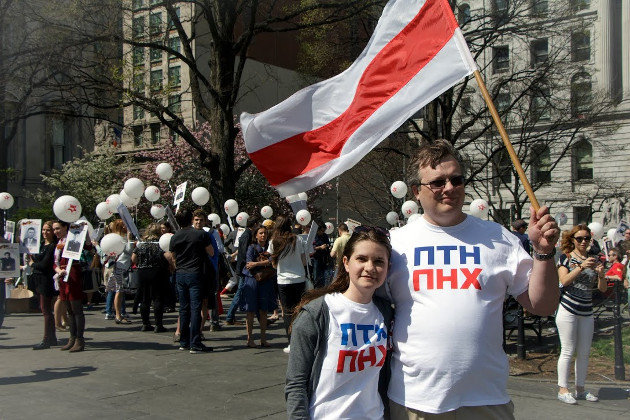 Украинцы и белорусы пришли на пророссийскую акцию в Нью-Йорке со своими национальными флагами и в майках с надписью «ПТН ПНХ». Они попали практически на все фотографии с мероприятия, пишет белорусское издание «Наша Нива».