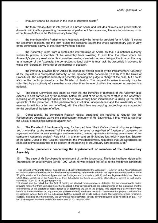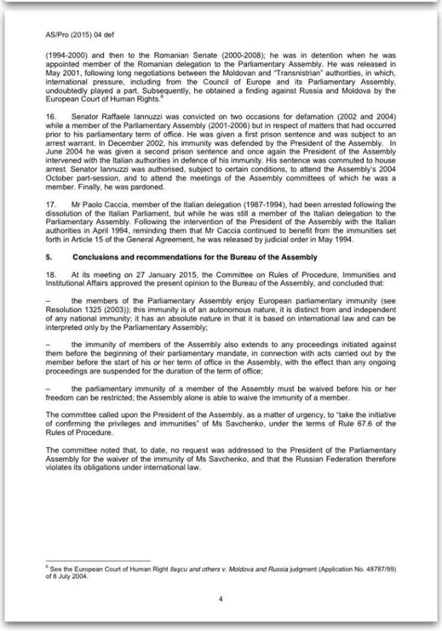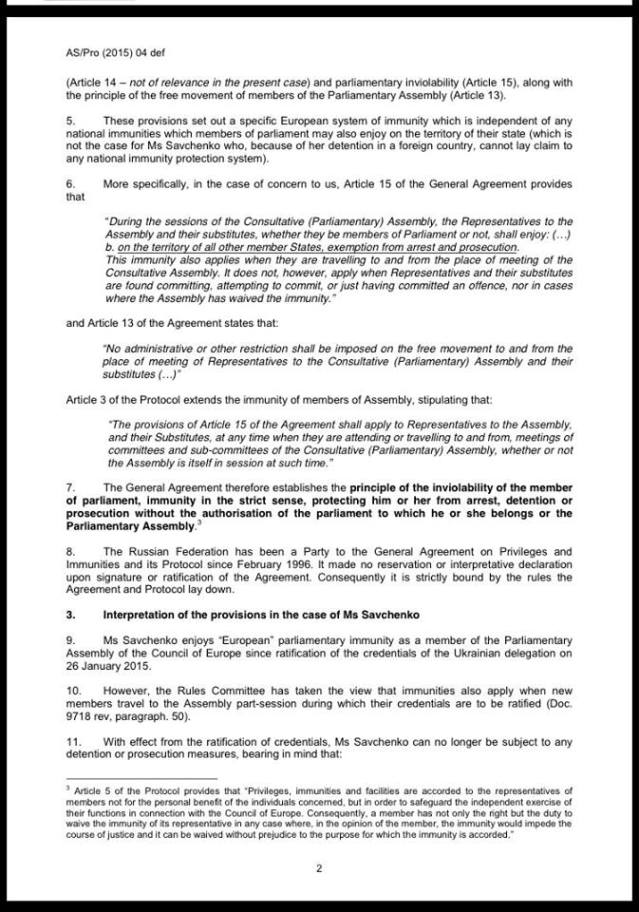 Комитет Парламентской ассамблеи Совета Европы подтвердил, что народный депутат, украинская летчица Надежда Савченко имеет иммунитет от судебного преследования. Один из адвокатов украинки Илья Новиков в Facebook обнародовал соответствующий документ ПАСЕ.