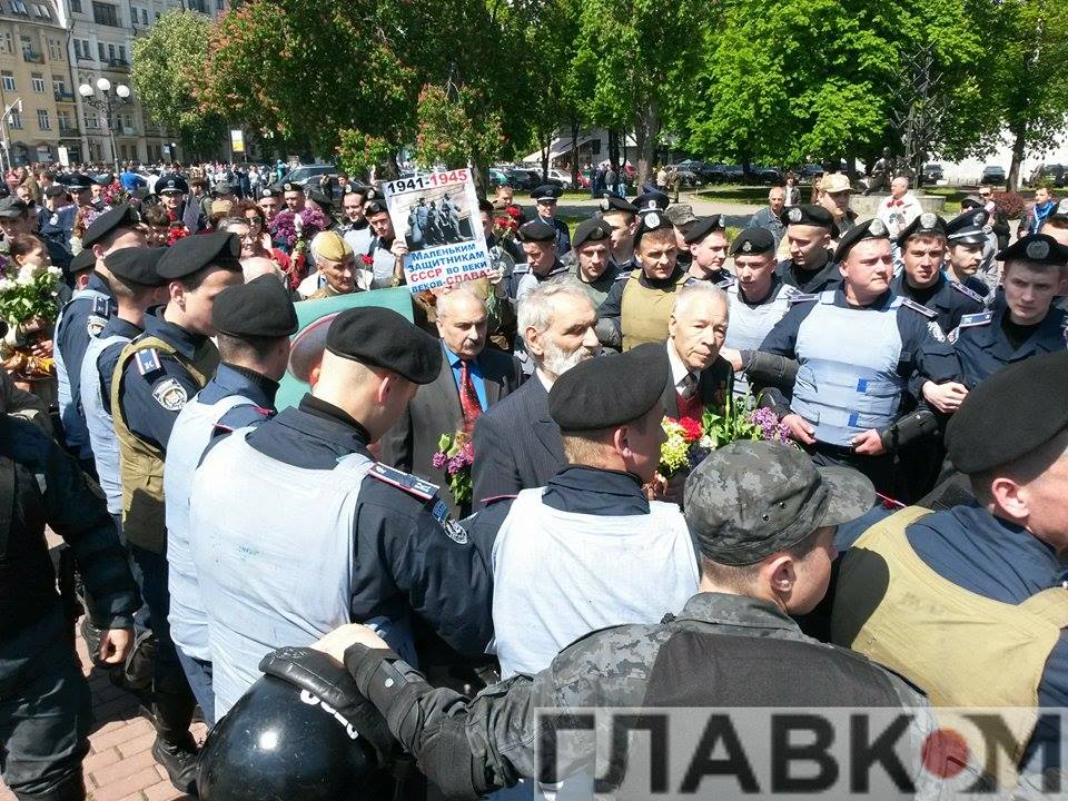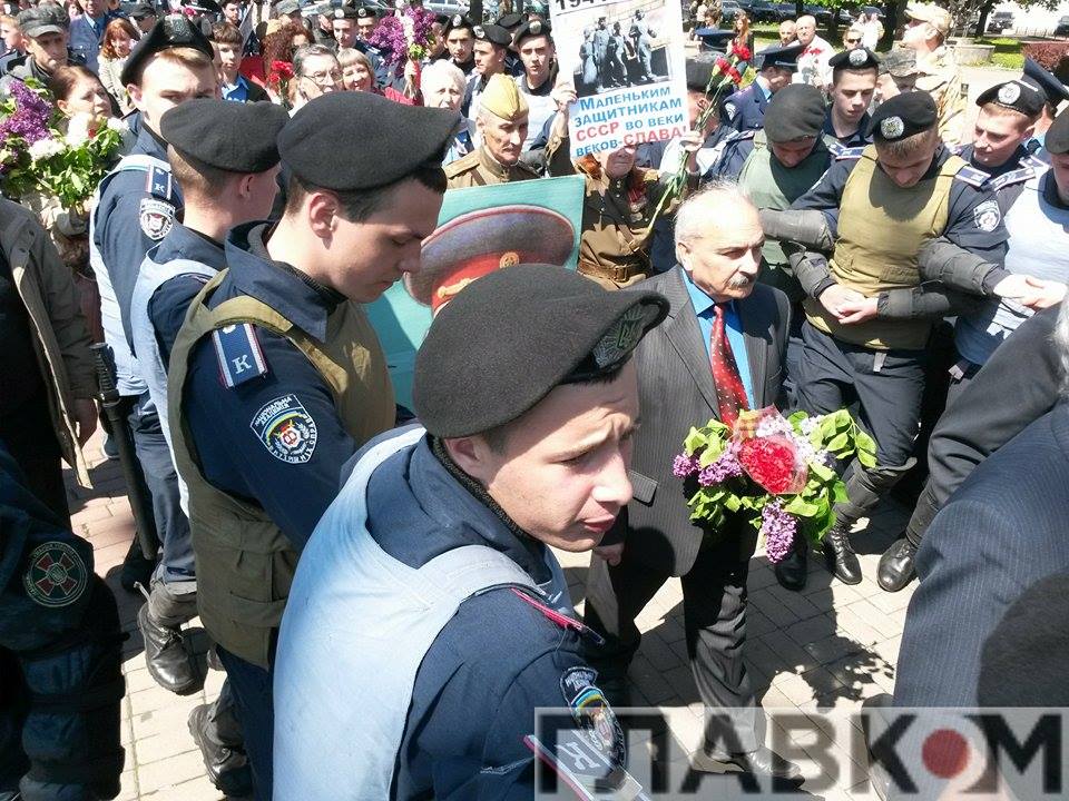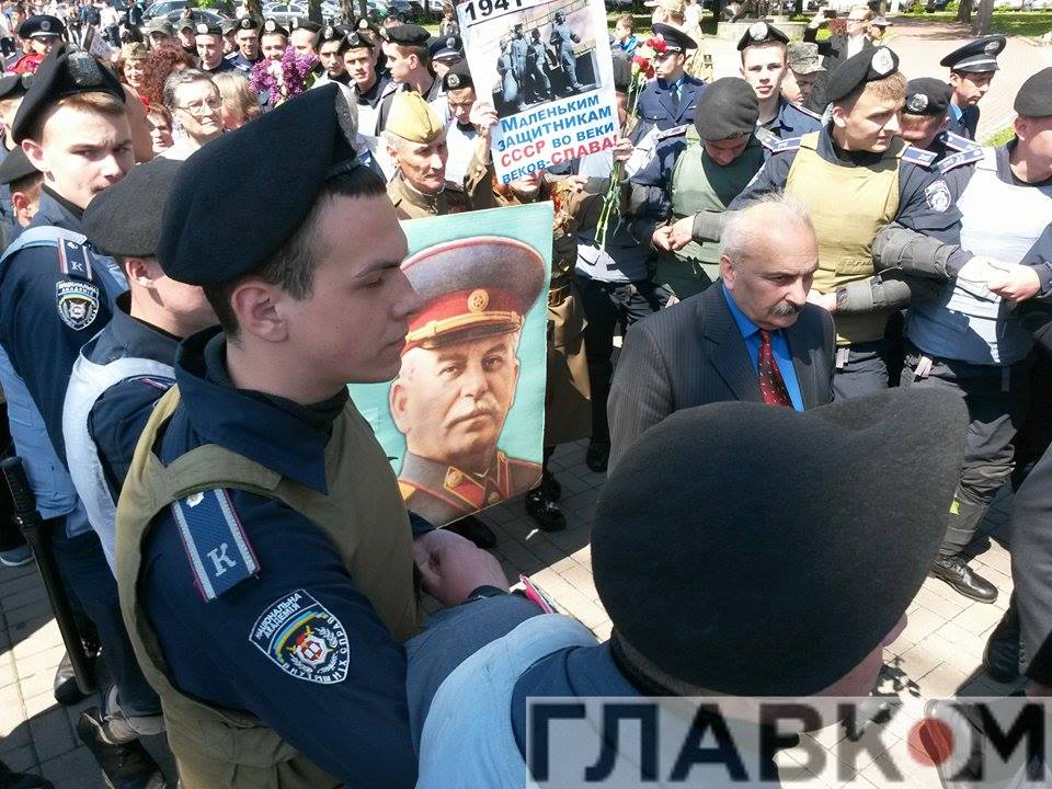 Нескольких пожилых людей, которые принесли с собой плакаты в том числе с изображением советского диктатора, окружили сотрудники МВД. Милиционеры защитили стариков, дав им возможность возложить цветы к монументу Славы.