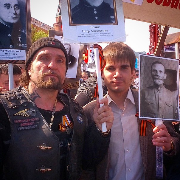 На фотографии изображены лидер клуба байкеров «Ночные волки» Александр «Хирург» Залдостанов и глава департамента культуры Москвы Александр Кибовский. Позади них идет человек, который несет плакат с подписью «Берия Лаврентий Павлович». Лица участника акции с портретом Берии не видно.