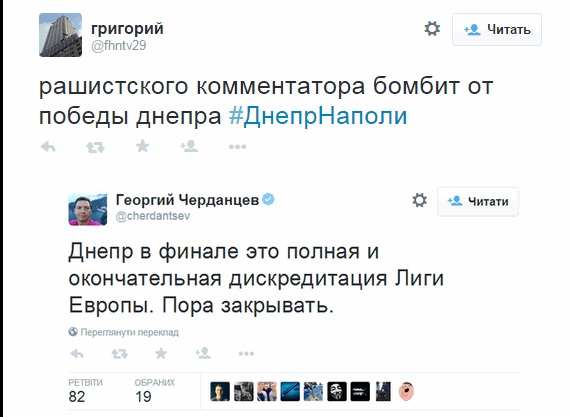 Российский спортивный комментатор Георгий Черданцев после выхода украинской футбольной команды «Днепр» в финал Лиги Европы, написал в своем твиттере, что это победа ничто иное как дискредитация Лиги Европы.