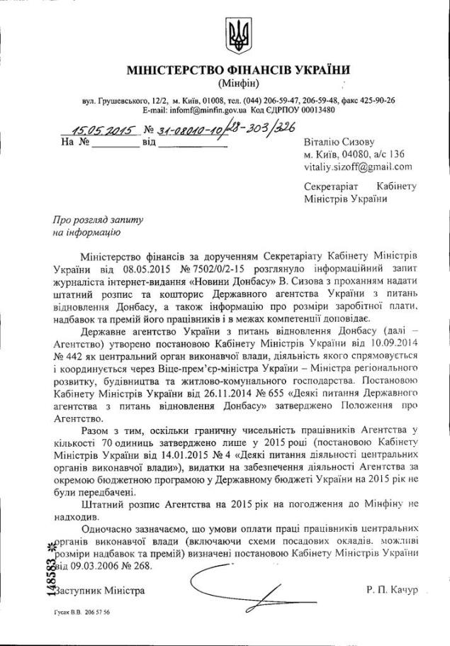 Расходы на обеспечение деятельности Государственного агентства Украины по вопросам восстановления Донбасса не были предусмотрены отдельной бюджетной программой в Госбюджете Украины на 2015 год. Об этом говорится в ответе Министерства финансов на запрос Новости Донбасса.