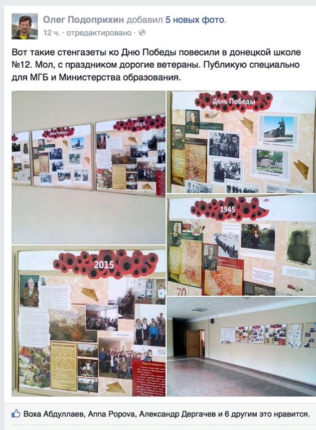 Бывший сотрудник телеканала «Интер», телеоператор Олег Подоприхин, который остался жить в Донецке после захвата города боевиками и теперь сотрудничает с «ДНР», пожаловался на своей страничке в Фейсбуке в так называемое «МГБ ДНР» на учителей донецкой гимназии №12, которые к 9 мая повесили в учебном заведении стенгазеты с изображениями красных маков. Подоприхина очевидно возмутило, что маки были изображены на стенгазетах вместо георгиевских лент.