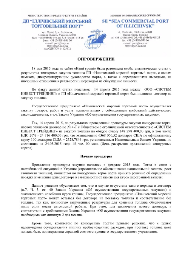 Пресс-служба опубликовала развернутый анализ положений подписанного 14 апреля 2015 г. контракта между ООО «Систем Инвест Трейдинг» и ГП «Ильичевский морской торговый порт», который исследовали авторы статьи.