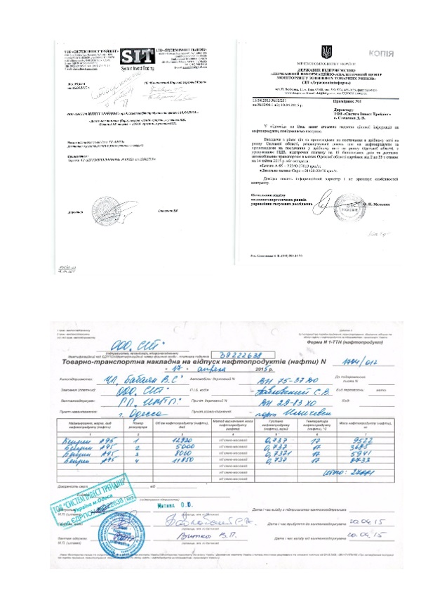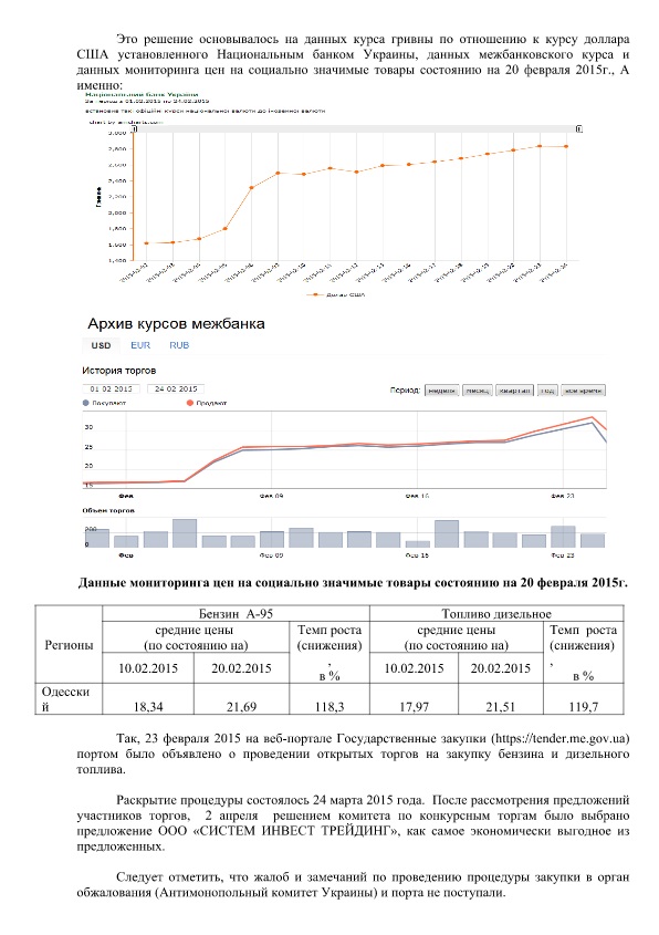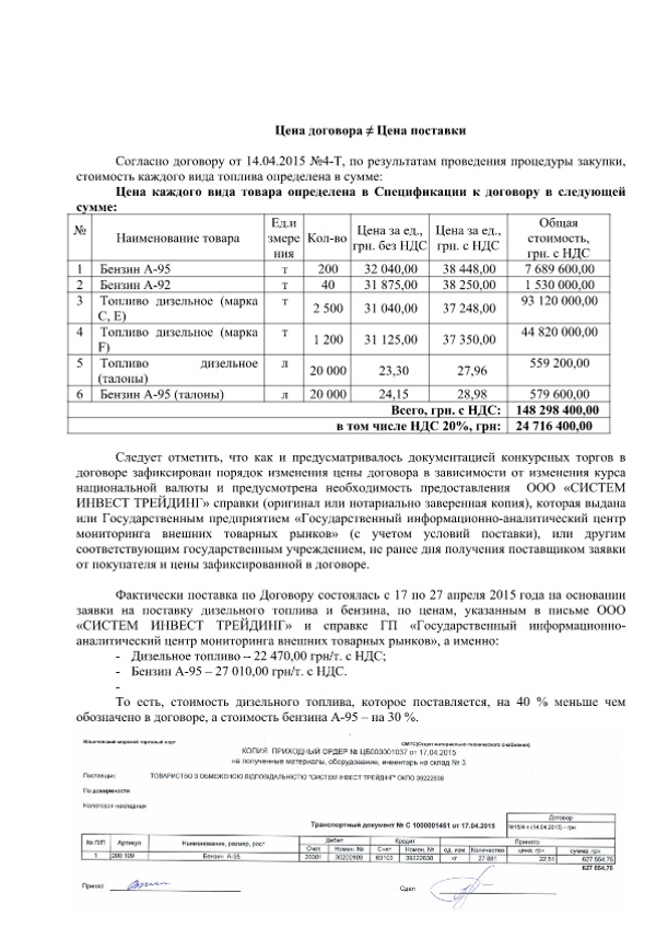 Фактически поставка по договору состоялась с 17 по 27 апреля 2015 г. на основании заявки на поставку дизельного топлива и бензина, по ценам, указанным в письме ООО «Систем Инвест Трейдинг» и справке ГП «Государственный информационно-аналитический центр мониторинга внешних товарных рынков», а именно: