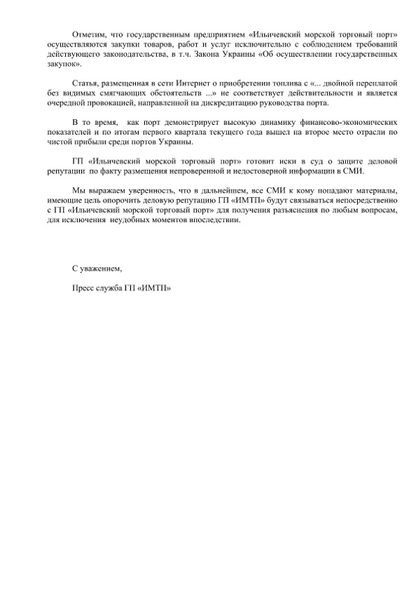 В пресс-службе также заявили, что ГП «Ильичевский морской торговый порт» готовит иски в суд о защите деловой репутации по факту размещения непроверенной и недостоверной информации в СМИ.