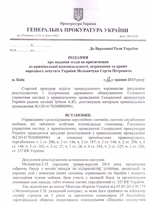 Об этом говорится в представлении генпрокурора в Верховную Раду, которое есть в распоряжении Українська правда