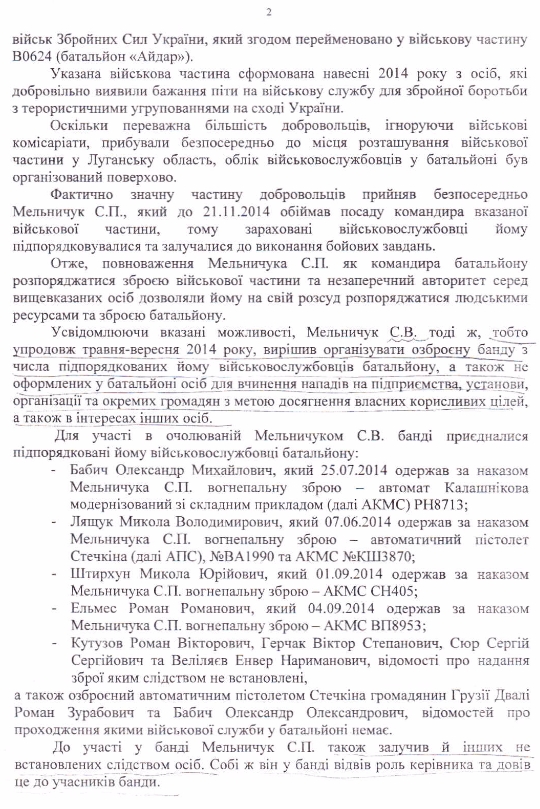 Как отмечено в документе, досудебное следствие установило, что Мельничук «на протяжении мая-сентября 2014 года организовал вооруженную банду с целью нападений на предприятия, учреждения, организации и отдельных личностей и совершения других преступлений, направленных на вооруженное и открытое завладение чужим имуществом, принимал участие в указанной банде и организовывал совершаемые ею нападения».