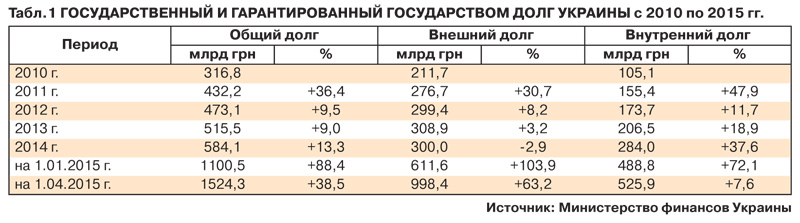 Несмотря на то, что в долларовом эквиваленте государственный и гарантированный долг снизился в прошлом году на $3,4 млрд — до $69,8 млрд, в гривневом эквиваленте из-за почти троекратной девальвации национальной валюты этот показатель за прошлый год увеличился на 88,2%, достигнув 1,1 трлн грн и перевалив за 70% отечественного ВВП. А по итогам курсовых пересчетов первого квартала уже нынешнего года его номинальная сумма достигла 1,5243 трлн грн, сравнявшись с прошлогодним номинальным ВВП страны (1,567 трлн грн).