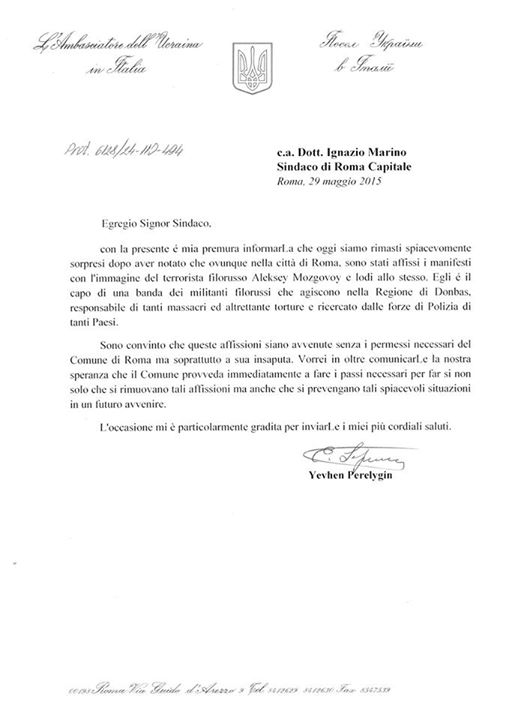 «В связи с появлением сегодня ночью на улицах Рима плакатов в поддержку уничтоженного террориста Мозгового Посол Украины в Италии Евгений Перелыгин обратился к мэру города Рима И.Марино с просьбой немедленно убрать этот «хлам» с улиц древнего города», - говорится в сообщении Посольства.