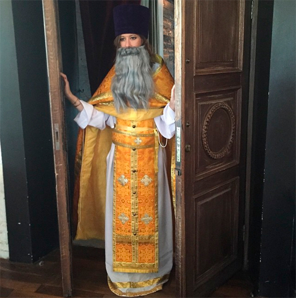 На фото Ксения Собчак изображена с накладной бородой и в церковной одежде. Под снимком была подпись: «Готовим с Красовским (Антон Красовский, российский журналист, – ред.) новый чудесный репортаж для Сноб. Угадайте, о чём».