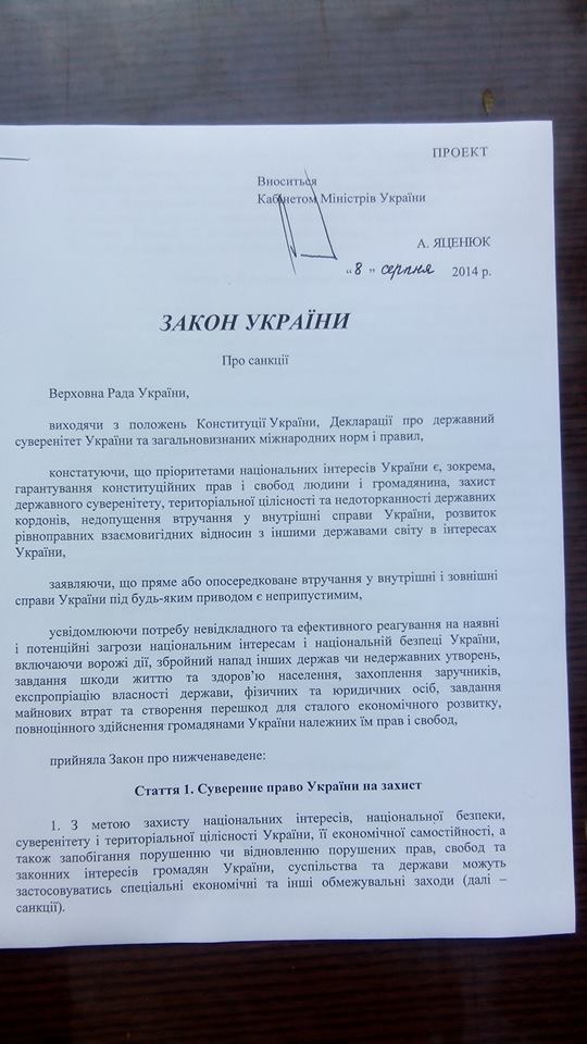 «Украина введет санкции по отношению к каждому физическому лицу, которое имеют паспорт гражданина Российской Федерации и поддерживает террористов и сепаратистов в Украине — или прямо, или косвенно», — объяснил Яценюк.