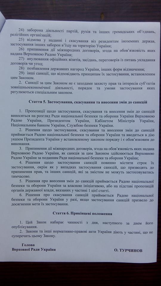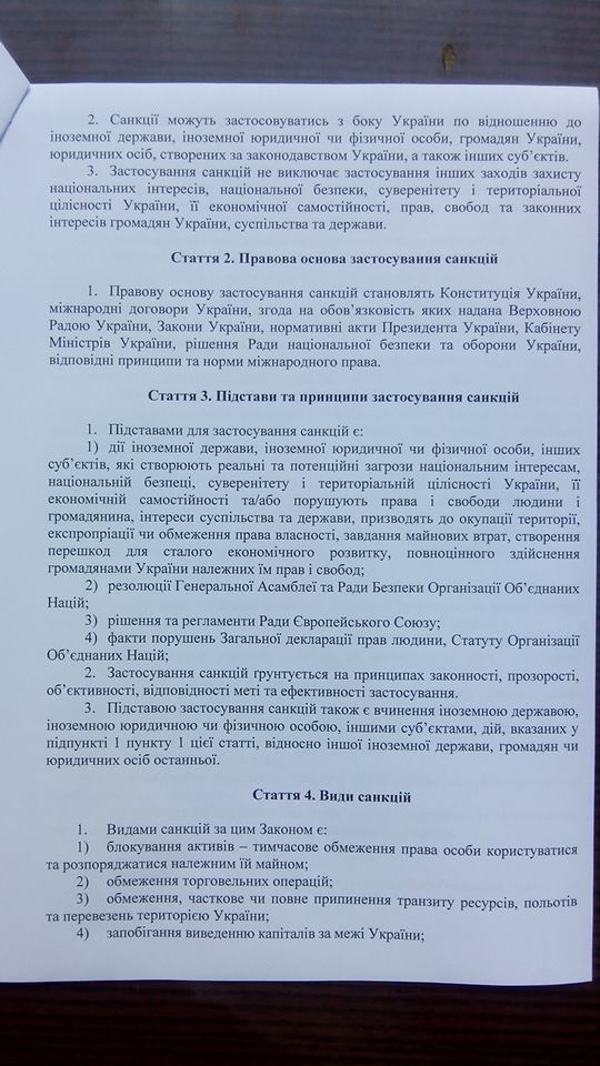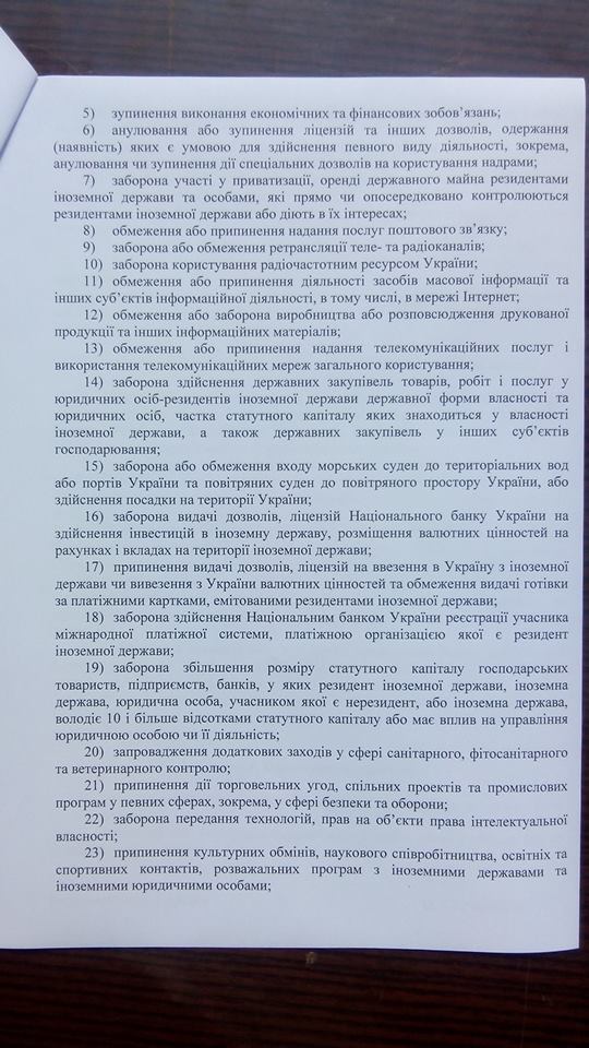 Санкции будут включать в себя замораживание активов, запреты на деятельность на территории Украины, вещания и работу в ее интернет-пространстве, в приватизации, пользовании лицензиями, а также транзит через территорию Украины.