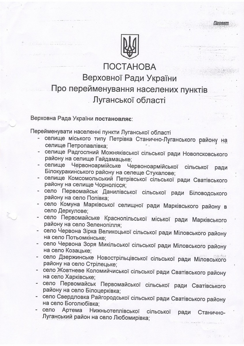 В Луганской области переименуют 19 населенных пунктов (документ)