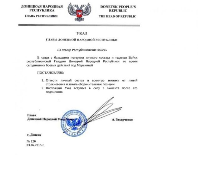Как сообщили 62.ua источники, 3 июня появился указ Захарченко «Об отводе республиканских войск».