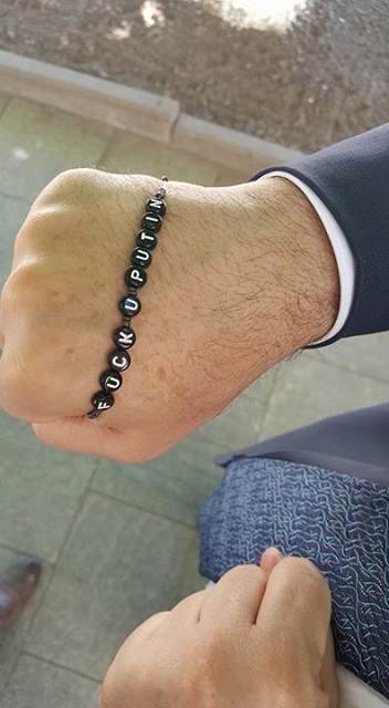 Министр внутренних дел Украины Арсен Аваков опубликовал в своем Фейсбуке фото «сувенира» из Канады, браслета с «антипутинской» фразой.