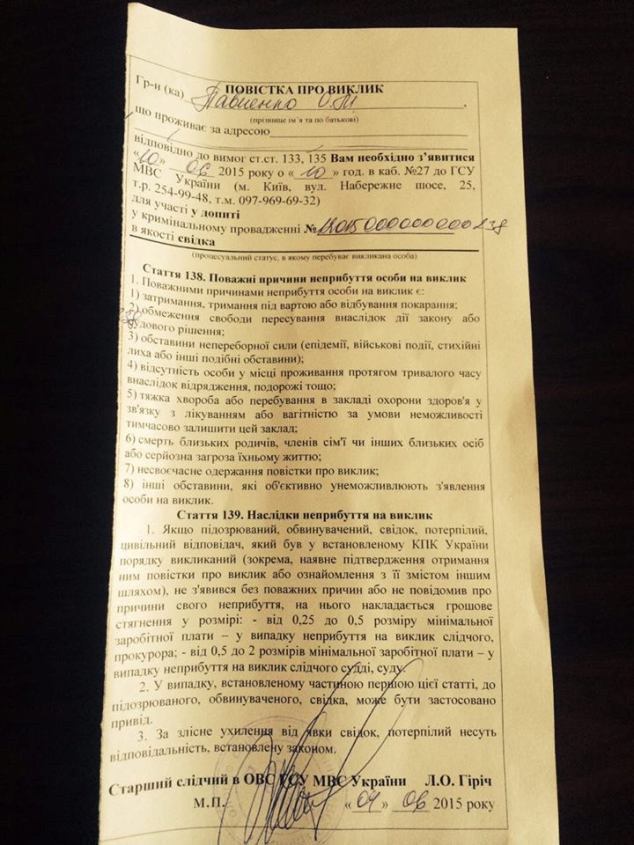 Павленко также выложил фотокопию повестки, в которой говорится, в частности, что ему нужно явиться 10 июня в 10 часов в ГСУ МВД Украины для участия в допросе в уголовном производстве в качестве свидетеля.